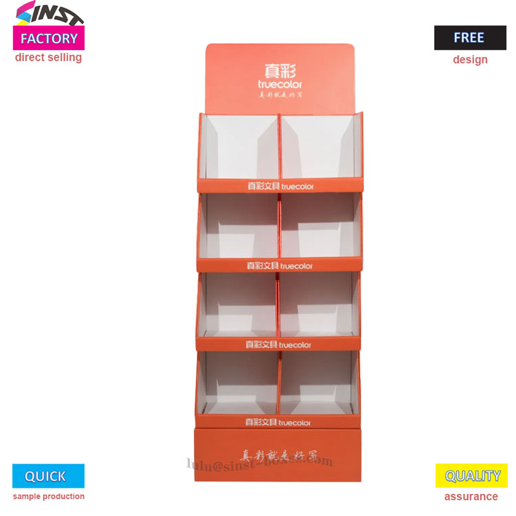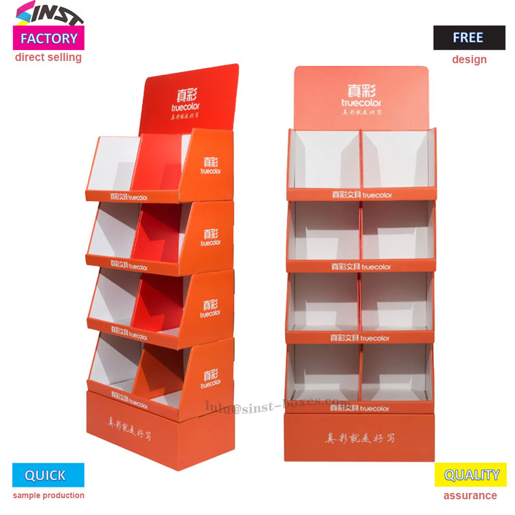 हे दोलायमान केशरी लाल कोरुगेटेड पेपर डिस्प्ले स्टँड हे दृश्य आकर्षण आणि ब्रँड इफेक्ट आर्टिफॅक्ट आहे. बाजूच्या आणि खालच्या बॉक्सच्या मुख्य भागाचा प्रत्येक स्तर ब्रँड लोगोसह वारंवार कोरला जातो, ज्यामुळे ग्राहकाची स्मरणशक्ती अधिक वाढते. पेपर टॉवेल कोरुगेटेड बॉक्स डिस्प्ले रॅक मजबूत कॉम्प्रेशन रेझिस्टन्ससह जाड कोरुगेटेड पेपर मटेरियलने बनलेला आहे आणि अनेक आयटम स्टॅक करताना ते खूप मजबूत आहे. स्वतंत्र कंपार्टमेंटसह मल्टी लेयर स्टॅक केलेली रचना, टिश्यू रोल, स्टेशनरी वस्तू आणि अडकल्याशिवाय सहज प्रवेशासाठी योग्य; सुपरमार्केटच्या जलद-चलित ग्राहकोपयोगी वस्तू विभागापासून ते सुविधा स्टोअरच्या चेकआउट काउंटरपर्यंत, ते उच्च कॉन्ट्रास्ट रंगांसह ग्राहकांचे लक्ष वेधून घेते, "डिस्प्ले रॅक" ला "सेल्स बूस्टर" मध्ये श्रेणीसुधारित करते, तुम्हाला उत्पादनाची एक्सपोजर सहज वाढविण्यात मदत करते,