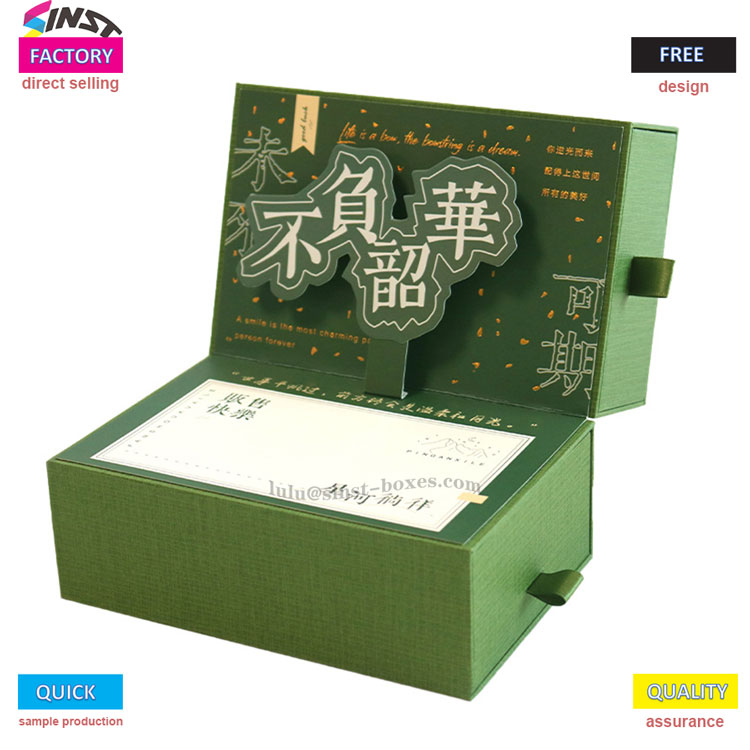हा परफ्यूम गिफ्ट बॉक्स, जो थेट SINST पॅकेजिंग आणि प्रिंटिंगद्वारे विकला जातो, मुख्य टोन म्हणून ताजे हिरवे रंग घेते. ड्रॉवर टाईप बॉक्स बॉडी त्रिमितीय कलात्मक वर्ण आणि सोन्याच्या सजावटीसह सुसज्ज आहे. परफ्यूम गिफ्ट बॉक्सची बाजू "शाओ" आणि "क्यूई" ने सुशोभित केलेली आहे आणि अंतर्गत कुशन ग्रूव्ह स्थिर आणि सुगंधित आहे, जे नाजूकपणा दर्शवते. भावना व्यक्त करण्यासाठी कलात्मक अर्थ आणि विधी भावना यांचे सहअस्तित्व ही गुणवत्ता निवड आहे.