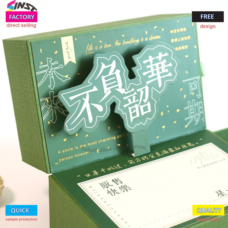 या डिलक्स गिफ्ट बॉक्सचे मुख्य भाग हिरव्या कापडाच्या पोत सामग्रीने झाकलेले आहे, ज्याला नाजूक स्पर्श आहे; बॉक्स कव्हर "नेव्हर गिव्ह अप टू यूथ" या पोकळ केलेल्या त्रिमितीय पात्रांभोवती केंद्रित आहे, लहान केशरी सजावटीने वेढलेले आहे. वरील शब्द इंग्रजीमध्ये छापलेले आहेत जसे की "A smile is the most charming", एक उबदार वातावरण आणि भेटवस्तू बॉक्सद्वारे वाहून नेलेल्या भावना व्यक्त करणे.