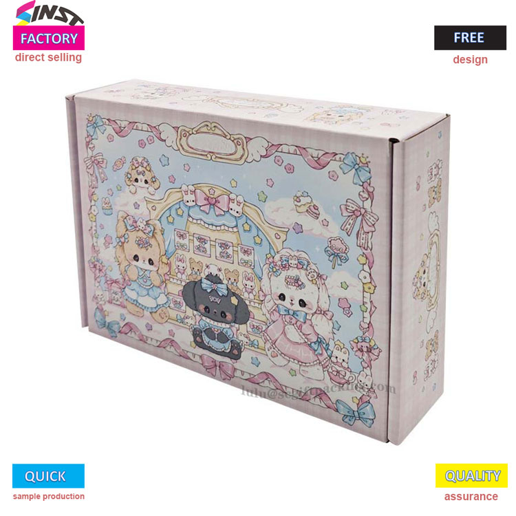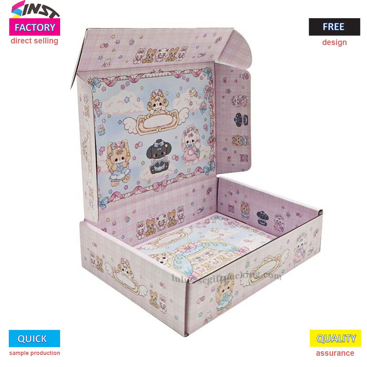 कपड्यांसाठी रंगीबेरंगी नालीदार पेपर एअरप्लेन बॉक्समध्ये हलके निळ्या अॅक्सेंटसह गोड गुलाबी रंगाची योजना आहे. बॉक्समध्ये फुलांचे हार, लहान प्राणी, धनुष्य, ढग आणि अंतःकरण यासारख्या व्यंगचित्र घटकांनी भरलेले आहे, एक स्वप्नाळू आणि गोंडस शैली तयार करते. देखावा पासून सेवेपर्यंत, हे कपड्यांचे पॅकेजिंग पूर्णपणे सक्षम करते आणि ब्रँड अपील वाढवते.