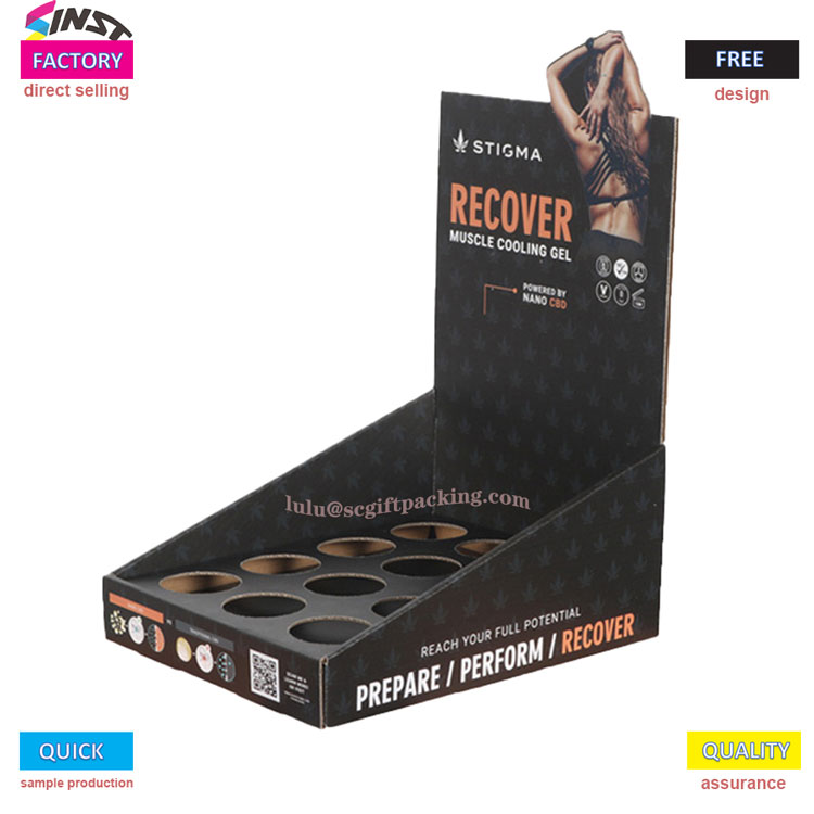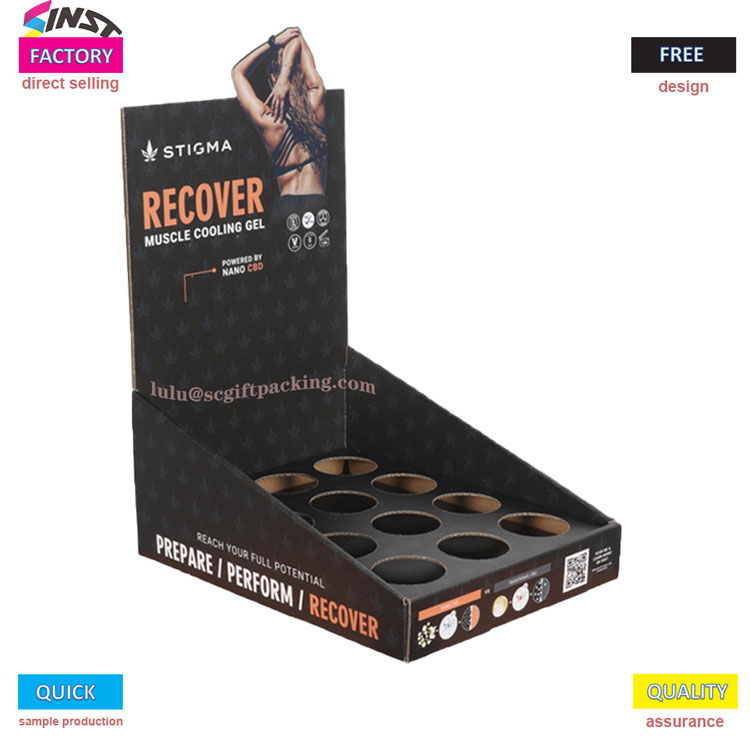 रिक्त स्पेस पेपरसह हे आरोग्य उत्पादन प्रदर्शन बॉक्समध्ये काळ्या पार्श्वभूमी हॉट स्टॅम्पिंग आणि एक शक्तिशाली व्हिज्युअल इफेक्टसह किमान सौंदर्याचा सौंदर्य आहे, जो व्यायामानंतर स्नायूंच्या विश्रांतीचा कोर विक्री बिंदू हायलाइट करतो. डिस्प्ले रॅक मल्टी ग्रिड परिपत्रक होल स्टोरेज डिझाइनचा अवलंब करतो, जो केवळ प्रदर्शन स्थिर करत नाही तर उत्पादनांचा पोत देखील सोडतो,