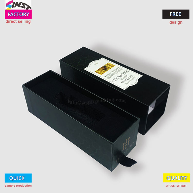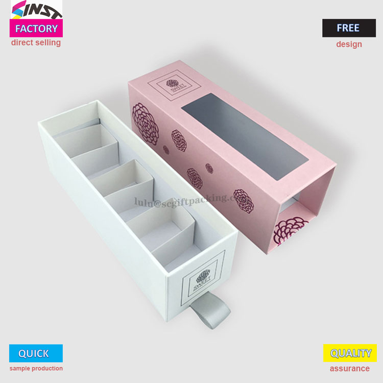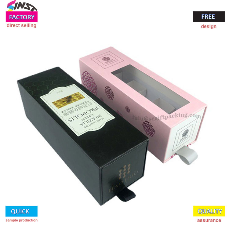 आवश्यक तेलासाठी लक्झरी कठोर ड्रॉवर स्लाइडिंग गिफ्ट बॉक्स पॅकेजिंग दोन -रंग गिफ्ट बॉक्स म्हणून डिझाइन केले आहे, ज्यामध्ये एक साधा आणि विलासी भावना निर्माण करण्यासाठी गुलाबी आणि काळ्या रंगांची टक्कर आहे - गुलाबी बॉक्स खोल जांभळ्या फुलझाडे/जांभळ्या नमुन्यांनी सुशोभित केलेला आहे, आणि सामग्रीच्या थेट दृश्यासाठी पारदर्शक खिडकीसह येतो; आतील अस्तरात एक पांढरा दुभाजक आणि पुल टॅब डिझाइन आहे, जे फक्त एक सौम्य पुलसह सहजपणे काढण्याची परवानगी देते. स्वच्छ आणि चिंता मुक्त वातावरण सुनिश्चित करण्यासाठी दागदागिने, सौंदर्य नमुने किंवा 30 एमएल प्रोपोलिस बाटल्या साठवण्यासाठी पाच स्वतंत्र कंपार्टमेंट्स उपलब्ध आहेत. नेल पॉलिश चिकट गिफ्ट बॉक्स, लिपस्टिक गिफ्ट बॉक्स, नमुना गिफ्ट बॉक्स इ. म्हणून वापरला जाऊ शकतो;