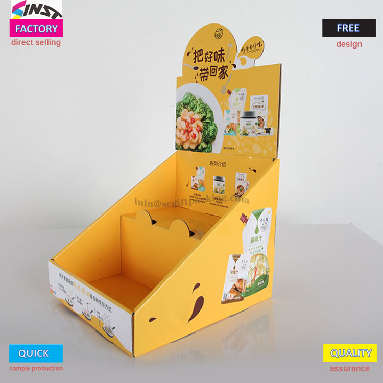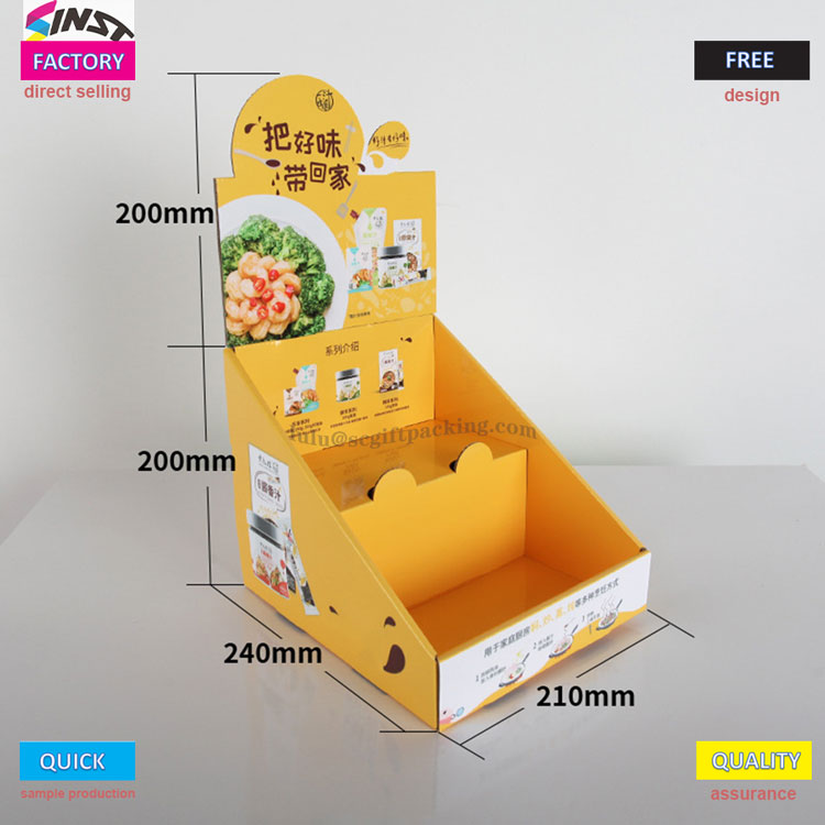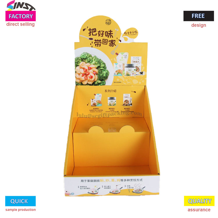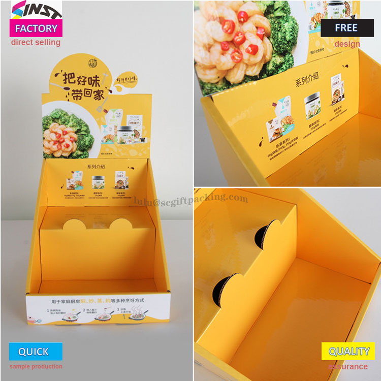 हा एक सुपरमार्केट सीझनिंग काउंटरटॉप कार्डबोर्ड डिस्प्ले बॉक्स आहे, जो मिरपूड डिस्प्ले बॉक्स, मीठ डिस्प्ले बॉक्स, चिकन एसेन्स डिस्प्ले बॉक्स इ. असू शकतो. हे मुख्यतः चमकदार पिवळ्या रंगात आहे आणि काउंटरटॉप डिस्प्लेसाठी लक्षवेधी साधन बनले आहे!